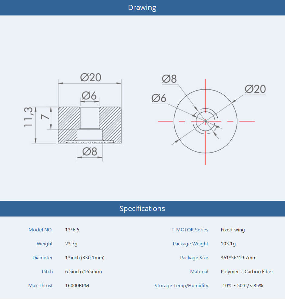 A T-Motor TS13x6,5 carbon polimer légcsavar kültéri repülőgépekhez.